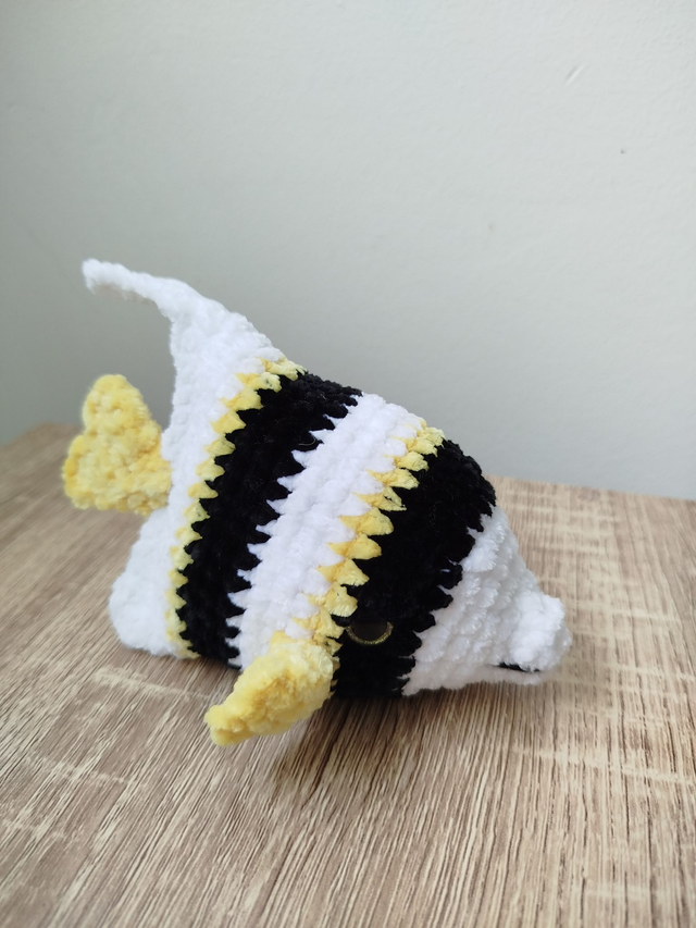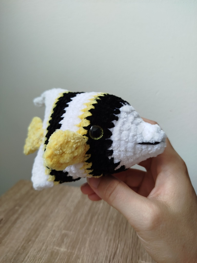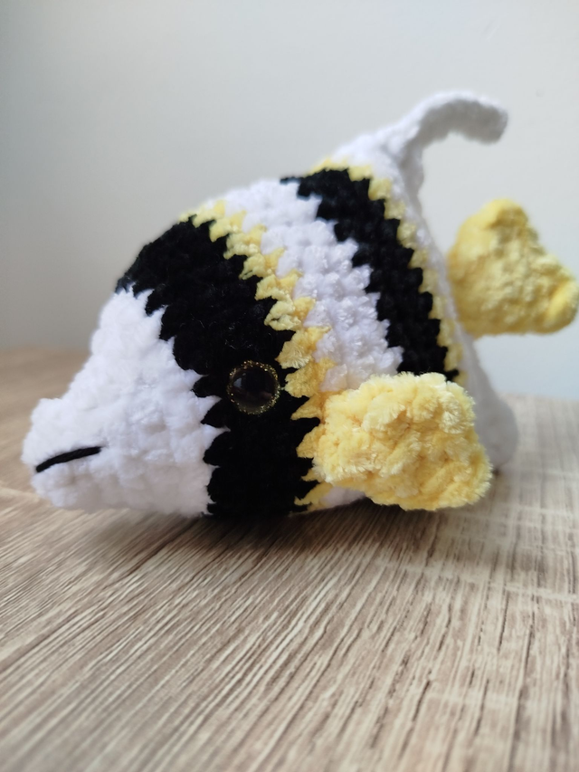 Ajoutez une touche marine et colorée à votre intérieur avec ce magnifique poisson-ange réalisé à la main au crochet. Ses élégantes nuances de blanc, noir et jaune lui donnent un charme tropical irrésistible. Lux, le poisson Ange mesure 16 × 10 × 10 cm et pèse 36g.