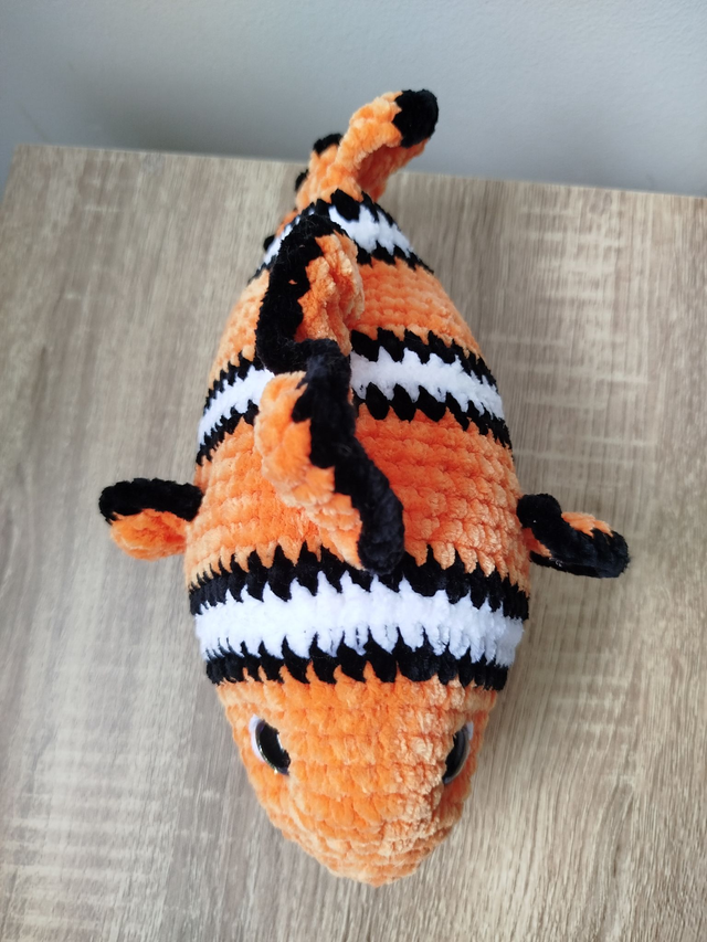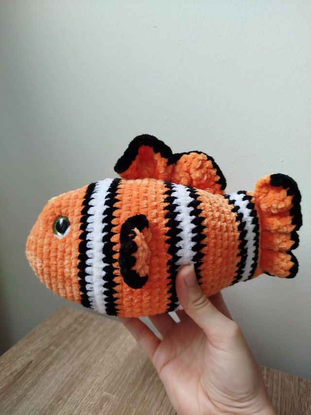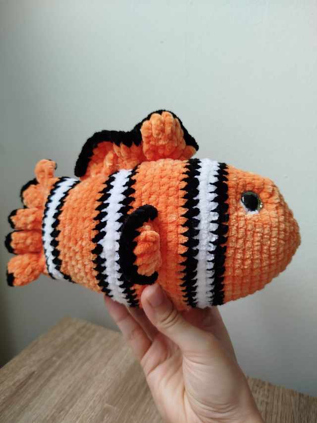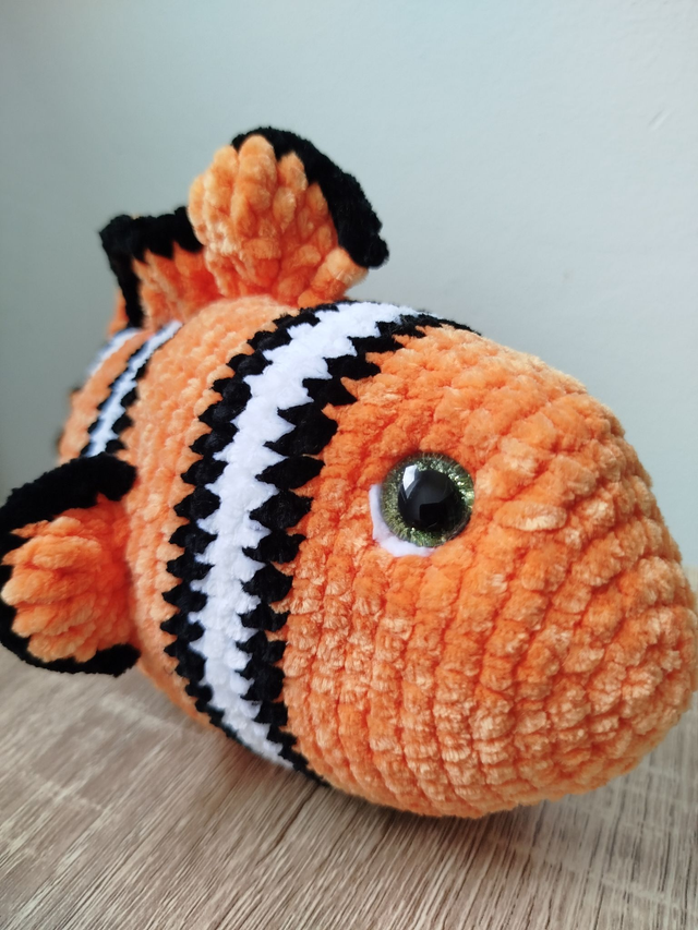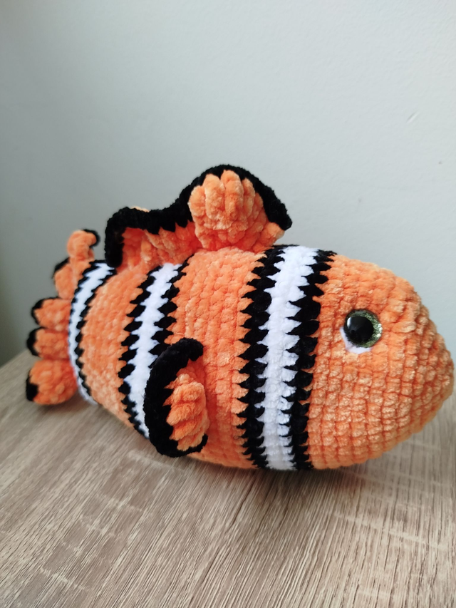 Plongez dans un univers poétique avec Némoé, un poisson clown fait main au crochet. Avec ses couleurs éclatantes – orange, noir et blanc – Némoé apporte une dose de bonne humeur à votre intérieur ou à votre collection de créations artisanales. Némoé mesure 25x17x13cm et pèse 116g.